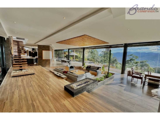 Espectacular casa ubicada en una exclusiva parcelación de El Poblado con menos de cinco años de construcción, cuenta con 412 metros cuadrados construidos sobre un terreno de aproximadamente cuatro mil metros cuadrados, rodeada de amplios ventanales que permiten disfrutar de una vista panorámica a la ciudad y de inolvidables atardeceres, ofrece espacios amplios y modernos como sala de estar con chimenea, comedor, cocina abierta, tres habitaciones cada una con baño, habitación de servicio con baño, baño social, estudio, jardín zen interior con cascada, deck, amplia zona verde exterior, área de BBQ, gimnasio privado, jacuzzi adaptado como piscina de agua fría y caseta para perro, con entrada totalmente privada e independiente dentro de una parcelación con seguridad veinticuatro horas que garantiza confort, privacidad y exclusividad.